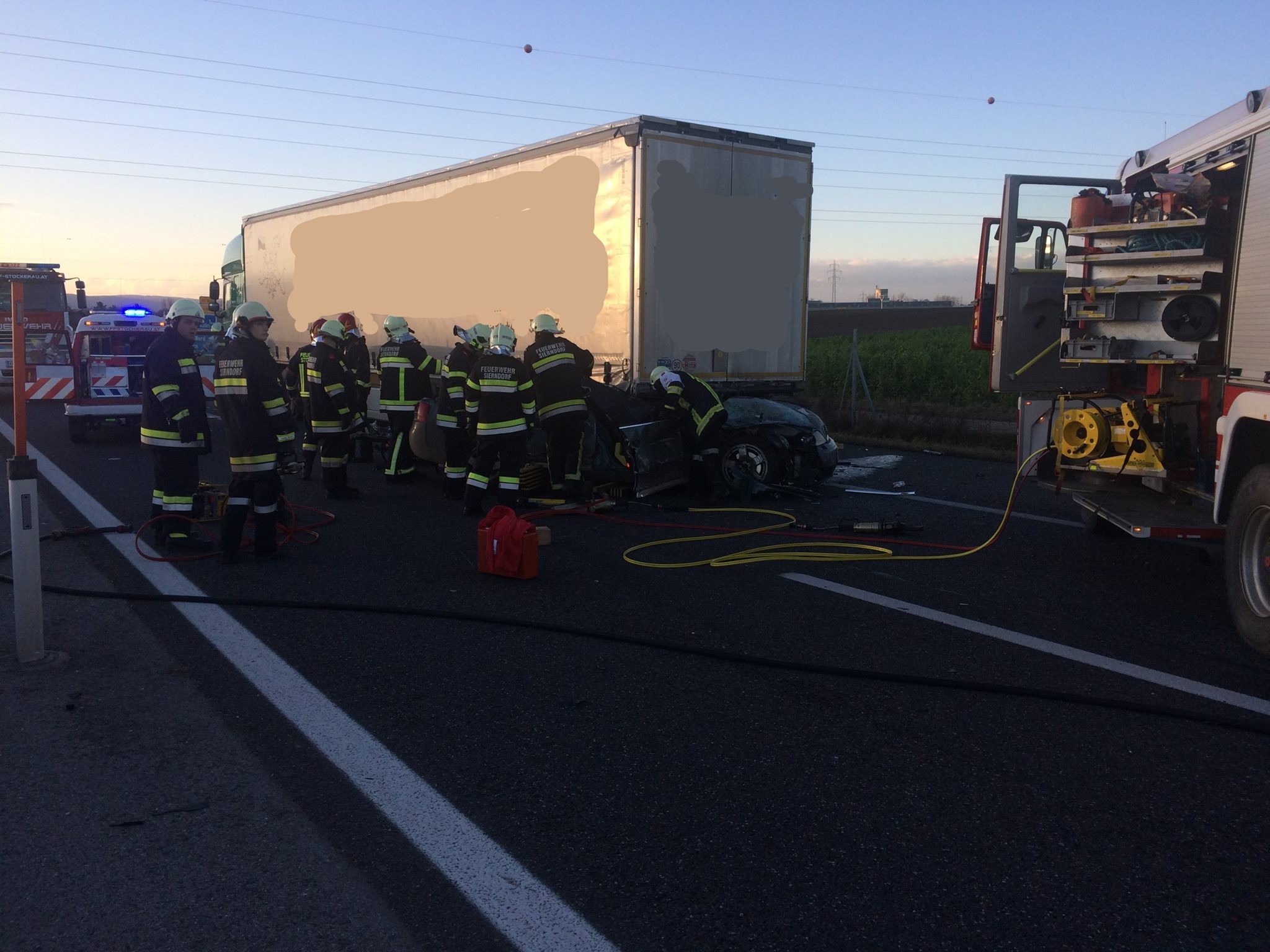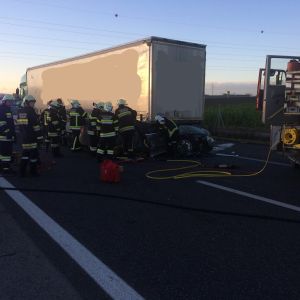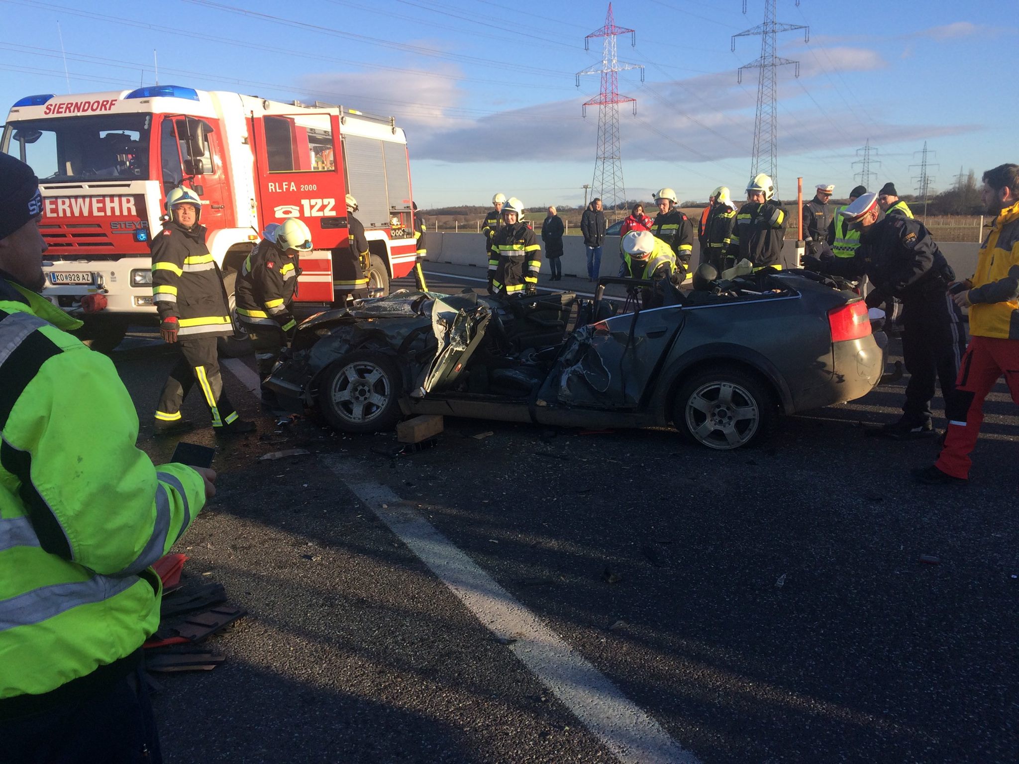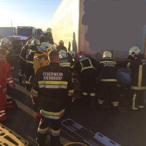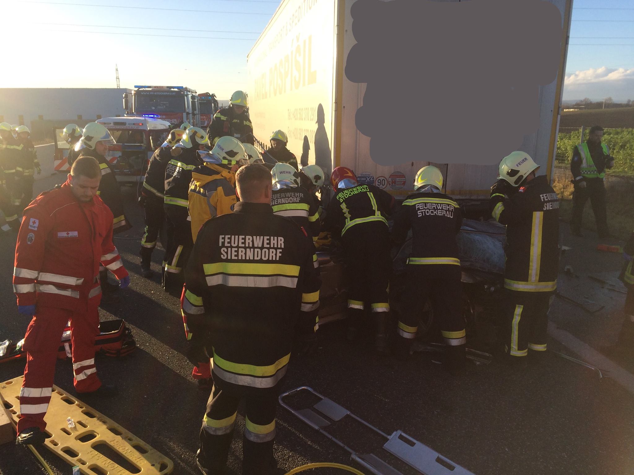 Ein PKW hat das Stauende übersehen und ist mit der Fahrerseite nahezu ungebremst in das Heck eines LKW geprallt. Die Fahrerin wurde dabei massiv eingeklemmt. Nach dem Eintreffen der FF Sierndorf und der FF Stockerau wurde eine Zugangsmöglichkeit für den Notarzt geschaffen. Parallel dazu wurde versucht den Sattelauflieger anzuheben um das Dach des PKW komplett entfernen zu können. Nach ca. 40 min konnte die schwer verletzte Fahrerin aus dem Fahrzeug gerettet werden. Nach einer Notversorgung im Notarztwagen wurde sie mit dem Rettungshubschrauber ins Krankenhaus geflogen.